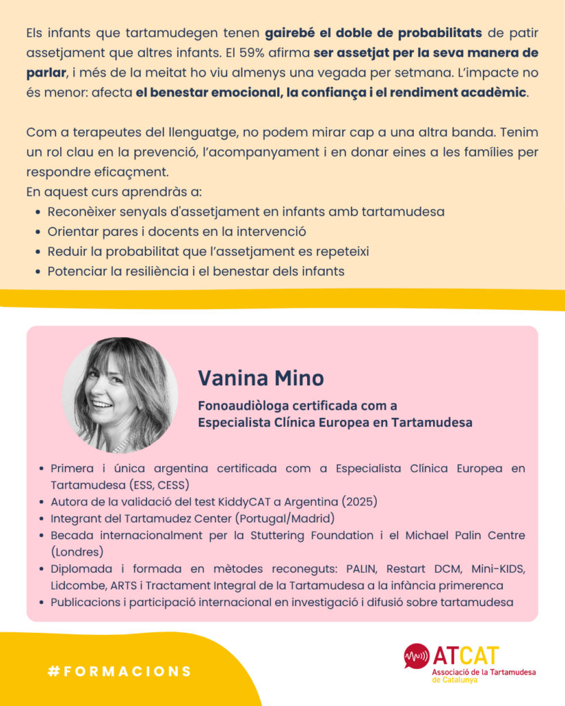 Per això mateix, aquesta primera formació abordarà la intervenció en etapa escolar però fent especial èmfasi al voltant de l’assetjament escolar. La formació anirà a càrrec de Vanina Mino, logopeda especialista en tartamudesa. Pots veure tota la informació al cartell adjunt.